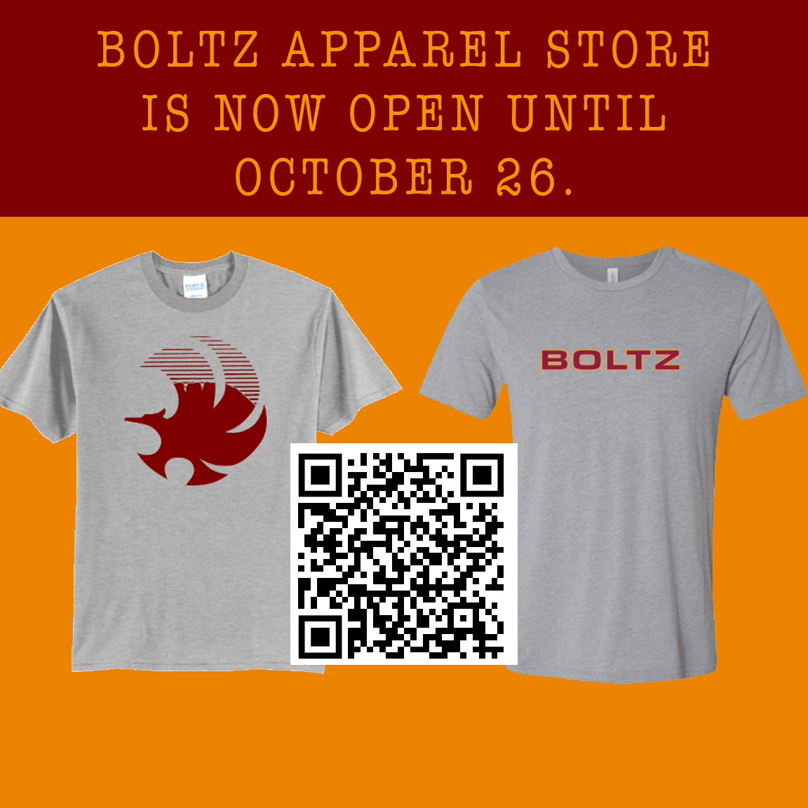 The Boltz apparel store is now open until October 26th. Please use the link below to order.